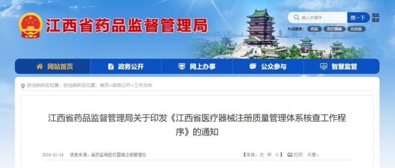 11月14日,江西省藥監(jiān)局發(fā)布《江西省醫(yī)療器械注冊(cè)質(zhì)量管理體系核查工作程序》(以下簡(jiǎn)稱(chēng)《工作程序》),并指出,《江西省藥品監(jiān)督管理局關(guān)于印發(fā)〈江西省醫(yī)療器械注冊(cè)質(zhì)量管理體系核查工作程序〉的通知》(贛藥監(jiān)規(guī)〔2022〕12號(hào))同時(shí)廢止。