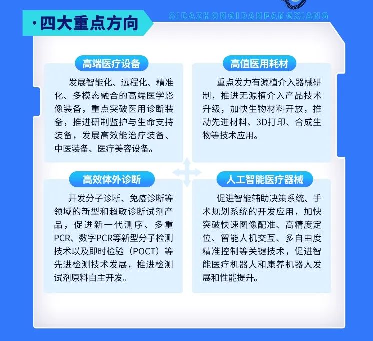 《行動計劃》共提出了四大重點方向、六個重大工程、八大保障措施,按照“融合創(chuàng)新、醫(yī)產(chǎn)協(xié)同、聯(lián)動發(fā)展、開放合作”的基本原則,圍繞產(chǎn)業(yè)規(guī)模、創(chuàng)新效益、企業(yè)實力、產(chǎn)業(yè)生態(tài)四個維度,提出到2026年總體規(guī)模突破500億元、打造專業(yè)化產(chǎn)業(yè)園區(qū)5個以上、創(chuàng)新品種累計突破100個、力爭培育億元級新產(chǎn)品10個以上、新增一批國家級或市級創(chuàng)新載體、支持建設(shè)一批創(chuàng)新醫(yī)療器械示范應(yīng)用中心、培訓(xùn)中心、產(chǎn)教融合基地等具體目標(biāo),力爭到“十五五”末建成對標(biāo)世界一流水平的高端創(chuàng)新醫(yī)療器械產(chǎn)業(yè)集群。