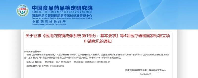 11月20日,國家藥監(jiān)局醫(yī)療器械標管中心發(fā)布《醫(yī)用內(nèi)窺鏡成像系統(tǒng) 第1部分:基本要求 》《醫(yī)用內(nèi)窺鏡成像系統(tǒng) 第4部分:熒光性能》《醫(yī)用內(nèi)窺鏡成像系統(tǒng)第5部分:3D性能》《角膜塑形用硬性透氣接觸鏡》共4項2025年醫(yī)療器械國家標準立項申請意見的通知,同時隨附了各項標準草案,并向社會公開征求意見。