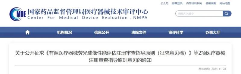 11月28日,國(guó)家藥監(jiān)局器審中心發(fā)布《有源醫(yī)療器械熒光成像性能評(píng)估注冊(cè)審查指導(dǎo)原則(征求意見(jiàn)稿)》《二氧化碳激光治療設(shè)備注冊(cè)審查指導(dǎo)原則(征求意見(jiàn)稿)》等2項(xiàng)指導(dǎo)原則,并向社會(huì)公開(kāi)征求意見(jiàn)。
