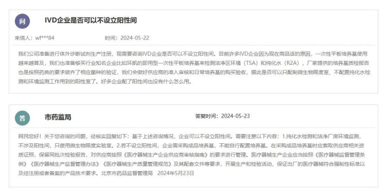 根據(jù)北京市藥監(jiān)局的答復(fù),此情形下企業(yè)可以不設(shè)立陽性間。需要注意以下內(nèi)容:1.純化水檢測和潔凈廠房環(huán)境監(jiān)測,不涉及陽性間,只使用微生物限度實(shí)驗(yàn)室。2.若不設(shè)立陽性間,企業(yè)需采購成品培養(yǎng)基,不能自行配置培養(yǎng)基。在采購成品培養(yǎng)基時應(yīng)索取供應(yīng)商相關(guān)資質(zhì)證照,保留同批次檢驗(yàn)報告,對供應(yīng)商按照《醫(yī)療器械生產(chǎn)企業(yè)供應(yīng)商審核指南》的要求進(jìn)行管理。醫(yī)療器械生產(chǎn)企業(yè)應(yīng)當(dāng)按照《醫(yī)療器械監(jiān)督管理?xiàng)l例》《醫(yī)療器械生產(chǎn)監(jiān)督管理辦法》《醫(yī)療器械生產(chǎn)質(zhì)量管理規(guī)范》及其配套文件等要求,開展生產(chǎn)和檢驗(yàn)活動,保證出廠的醫(yī)療器械符合強(qiáng)制性標(biāo)準(zhǔn)以及經(jīng)注冊或者備案的產(chǎn)品技術(shù)要求。