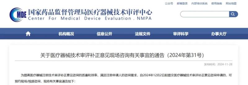 近日,國家藥監(jiān)局器審中心發(fā)布《關(guān)于醫(yī)療器械技術(shù)審評補正意見現(xiàn)場咨詢有關(guān)事宜的通告》,其中提到,自2024年12月2日起提交醫(yī)療器械技術(shù)審評補正意見咨詢申請的,可預(yù)約現(xiàn)場/視頻咨詢,有關(guān)事宜通告如下: