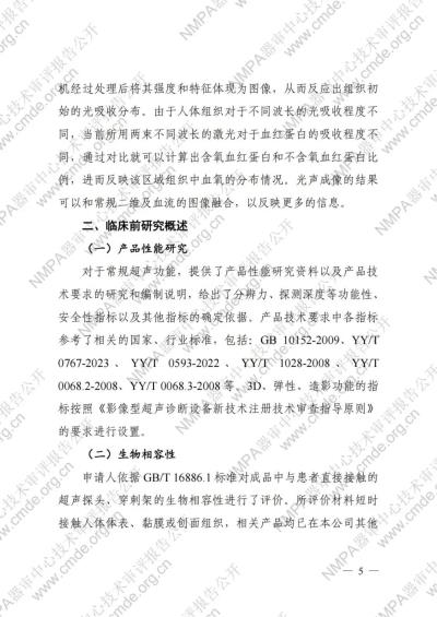 產(chǎn)品利用超聲回波及多普勒等原理,實(shí)現(xiàn)對(duì)人體組織的超聲成像。產(chǎn)品具有多種不同的成像模式和后處理功能,不涉及深度學(xué)習(xí)算法??蛇x配不同型號(hào)的探頭以及穿刺架、耦合劑加熱器等不同部件。 除常規(guī)超聲功能外,本產(chǎn)品還具有光聲成像功能,在線陣探頭的基礎(chǔ)上增加同步輸出的近紅外激光,當(dāng)組織被激光照射吸收光的部分能量后產(chǎn)生熱膨脹,并以特定機(jī)械波的形式釋放出去從而產(chǎn)生相應(yīng)頻率的超聲信號(hào),探頭接受該信號(hào)傳輸?shù)街鳈C(jī)經(jīng)過(guò)處理后將其強(qiáng)度和特征體現(xiàn)為圖像,從而反應(yīng)出組織初始的光吸收分布。由于人體組織對(duì)于不同波長(zhǎng)的光吸收程度不同,當(dāng)前所用兩束不同波長(zhǎng)的激光對(duì)于血紅蛋白的吸收程度不同,通過(guò)對(duì)比就可以計(jì)算出含氧血紅蛋白和不含氧血紅蛋白比例,進(jìn)而反映該區(qū)域組織中血氧的分布情況。光聲成像的結(jié)果可以和常規(guī)二維及血流的圖像融合,以反映更多的信息。
