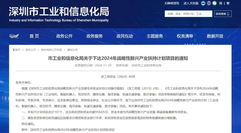 近日,深圳市工業(yè)和信息化局對2024年戰(zhàn)略性新興產(chǎn)業(yè)扶持計劃(工業(yè)母機、智能機器人、低空經(jīng)濟、精密儀器、海洋裝備、軌道交通裝備、醫(yī)療裝備)項目予以下達,其中提到,本批次計劃項目合計107個,共包括100個產(chǎn)業(yè)鏈關(guān)鍵環(huán)節(jié)提升項目、3個產(chǎn)業(yè)服務(wù)體系項目及4個市場準入項目,涉及政府資助資金總額9584萬元,資金來源為市戰(zhàn)略性新興產(chǎn)業(yè)發(fā)展-高端裝備集群專項資金。