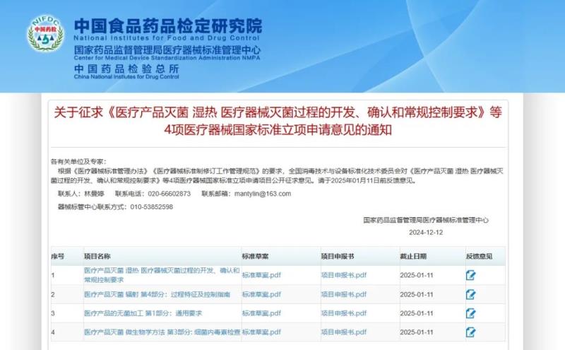 12月12日,國家藥監(jiān)局醫(yī)療器械標管中心發(fā)布《醫(yī)療產品滅菌濕熱醫(yī)療器械滅菌過程的開發(fā)、確認和常規(guī)控制要求》《醫(yī)療產品滅菌 輻射 第4部分:過程特征及控制指南》《醫(yī)療產品的無菌加工第1部分:通用要求》《醫(yī)療產品滅菌 微生物學方法 第3部分:細菌內毒素檢查》共4項醫(yī)療器械國家標準立項申請意見的通知,同時隨附了各項標準草案,并向社會公開征求意見。
