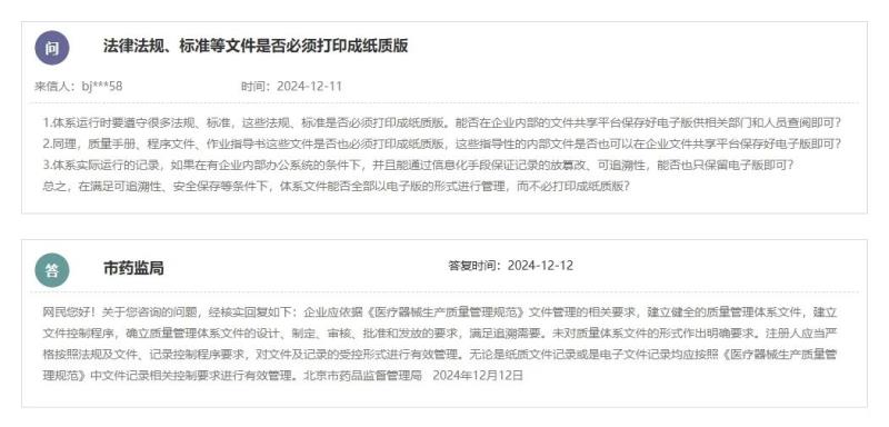 根據(jù)北京市藥監(jiān)局的答復(fù),企業(yè)應(yīng)依據(jù)《醫(yī)療器械生產(chǎn)質(zhì)量管理規(guī)范》文件管理的相關(guān)要求,建立健全的質(zhì)量管理體系文件,建立文件控制程序,確立質(zhì)量管理體系文件的設(shè)計(jì)、制定、審核、批準(zhǔn)和發(fā)放的要求,滿足追溯需要。未對質(zhì)量體系文件的形式作出明確要求。注冊人應(yīng)當(dāng)嚴(yán)格按照法規(guī)及文件、記錄控制程序要求,對文件及記錄的受控形式進(jìn)行有效管理。無論是紙質(zhì)文件記錄或是電子文件記錄,均應(yīng)按照《醫(yī)療器械生產(chǎn)質(zhì)量管理規(guī)范》中文件記錄相關(guān)控制要求進(jìn)行有效管理。