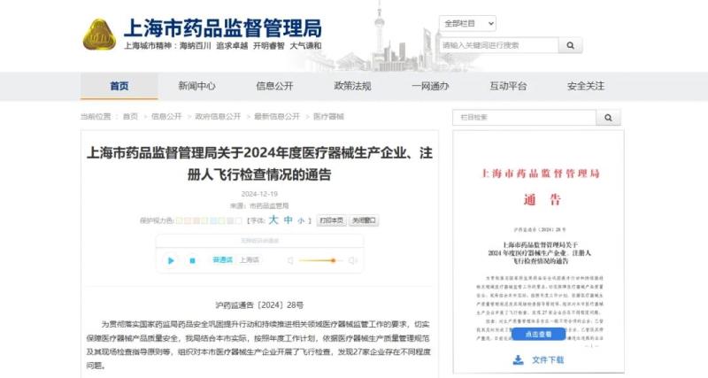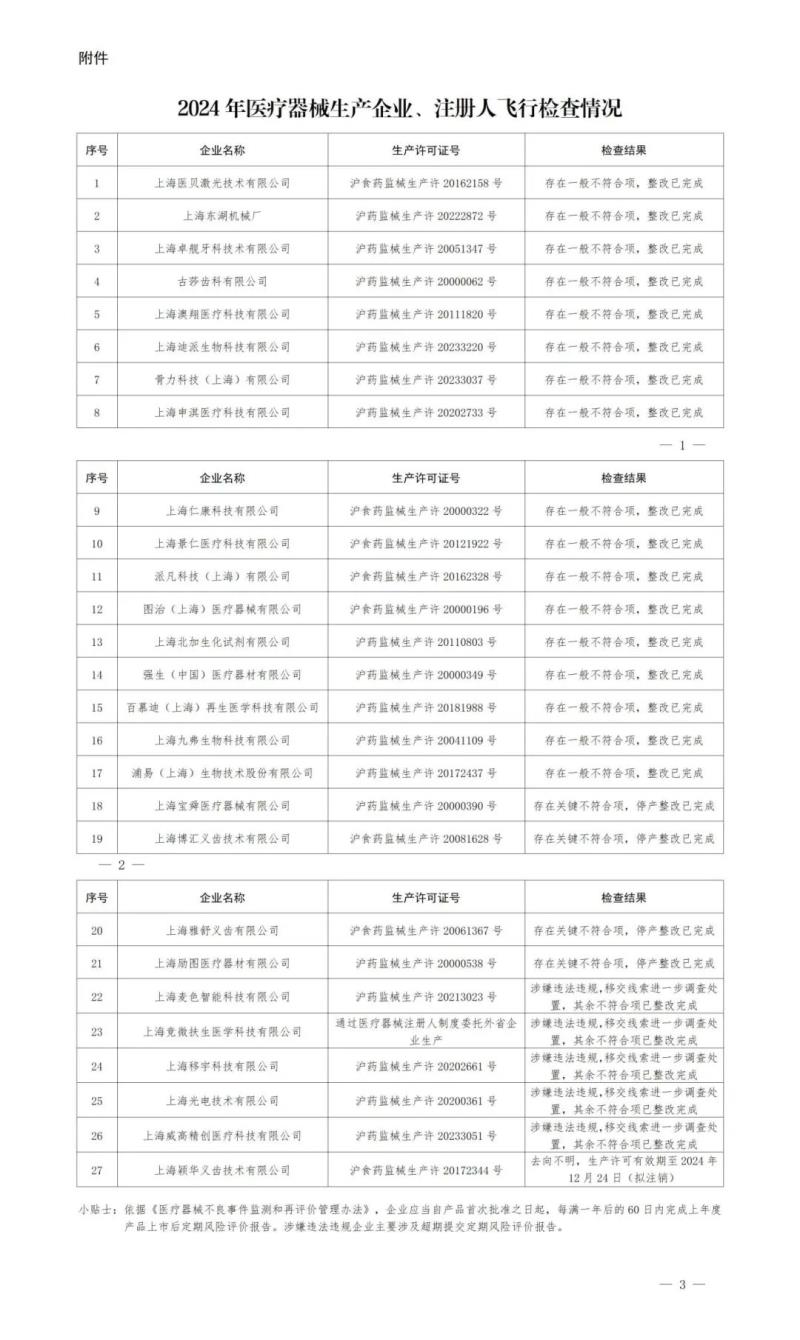 12月19日,上海市藥監(jiān)局發(fā)布《關(guān)于2024年度醫(yī)療器械生產(chǎn)企業(yè)、注冊人飛行檢查情況的通告》,其中提到,依據(jù)醫(yī)療器械生產(chǎn)質(zhì)量管理規(guī)范及其現(xiàn)場檢查指導原則等,該局組織對上海市醫(yī)療器械生產(chǎn)企業(yè)開展了飛行檢查,發(fā)現(xiàn)27家企業(yè)存在不同程度問題,其中17家企業(yè)存在一般不符合項,4家企業(yè)存在關(guān)鍵不符合項,5家企業(yè)涉嫌違法違規(guī),另有一家企業(yè)去向不明。其中有一點值得注意的是,涉嫌違法違規(guī)企業(yè)主要涉及超期提交定期風險評價報告。本次“飛檢”情況具體明細如下: