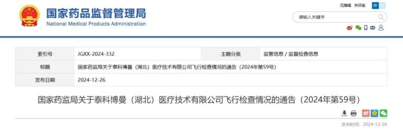 12月26日,國家藥監(jiān)局發(fā)布通告稱,該局組織檢查組對(duì)**(湖北)醫(yī)療技術(shù)有限公司進(jìn)行飛行檢查,發(fā)現(xiàn)該企業(yè)質(zhì)量管理體系主要存在以下缺陷: