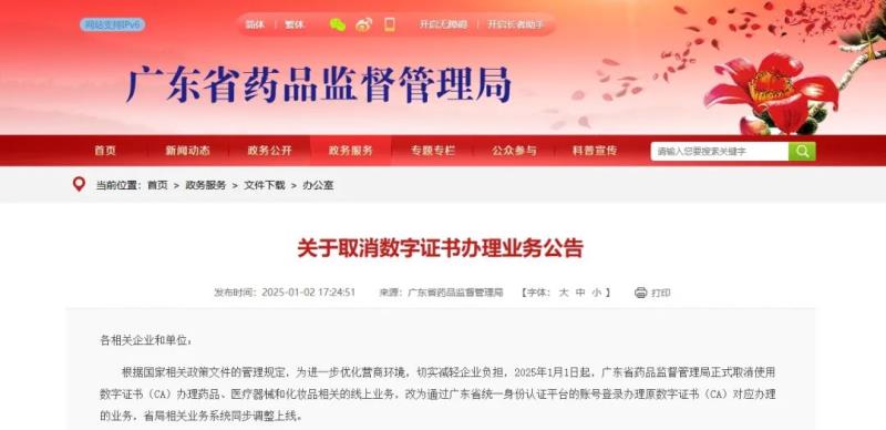 一、廣東省藥監(jiān)行業(yè)企業(yè)用戶免費領(lǐng)用的數(shù)字證書(含移動數(shù)字證書)通道同步關(guān)閉,已申領(lǐng)的企業(yè)用戶可持續(xù)使用至該數(shù)字證書有效期結(jié)束。 二、原使用數(shù)字證書(CA)辦理業(yè)務(wù)的通道繼續(xù)保留至業(yè)務(wù)辦理完畢,請各相關(guān)企業(yè)和單位在業(yè)務(wù)辦理完結(jié)后盡快完成切換。 三、在使用過程中有任何疑問和建議,請撥打020-37886123、020-37886352進行咨詢及答疑。