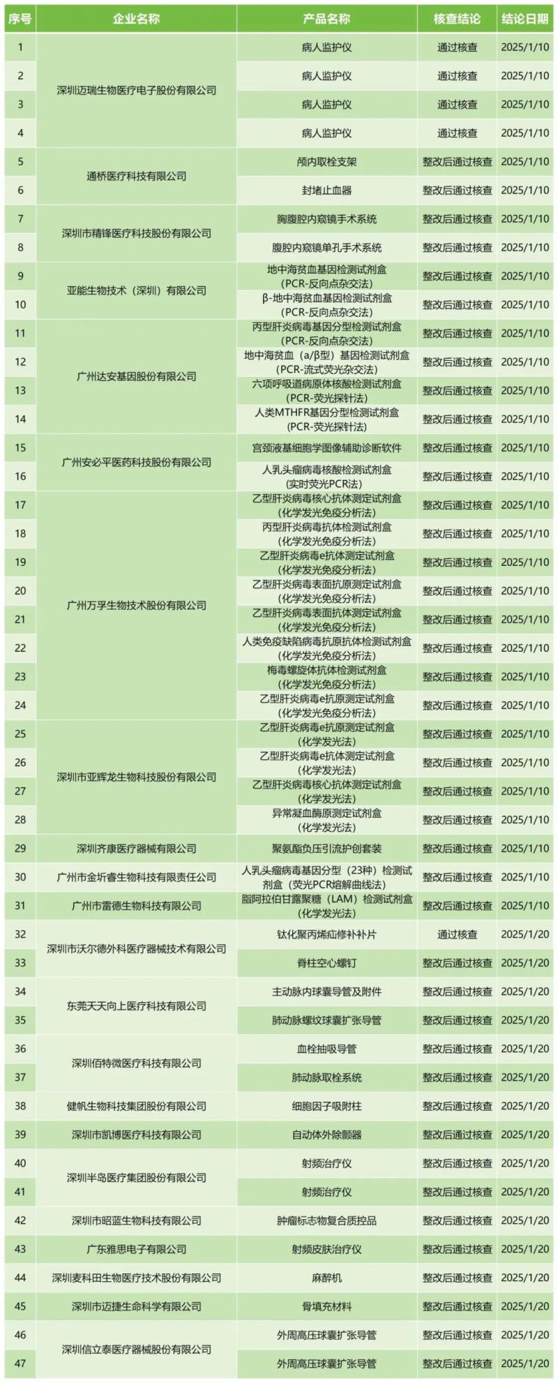 2月12日,廣東省藥監(jiān)局官網(wǎng)公布2025年1月醫(yī)療器械注冊質(zhì)量管理體系核查結(jié)果,包括深圳邁瑞生物醫(yī)療電子股份有限公司的四款病人監(jiān)護(hù)儀、深圳半島醫(yī)療集團(tuán)股份有限公司的兩款射頻治療儀、廣東雅思電子有限公司的射頻皮膚治療儀等共計(jì)47款產(chǎn)品,其中有五款產(chǎn)品核查結(jié)論為“通過核查”,其余均為“整改后通過核查”。具體明細(xì)見下方表格: