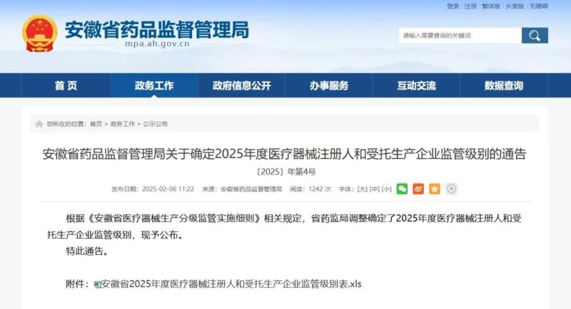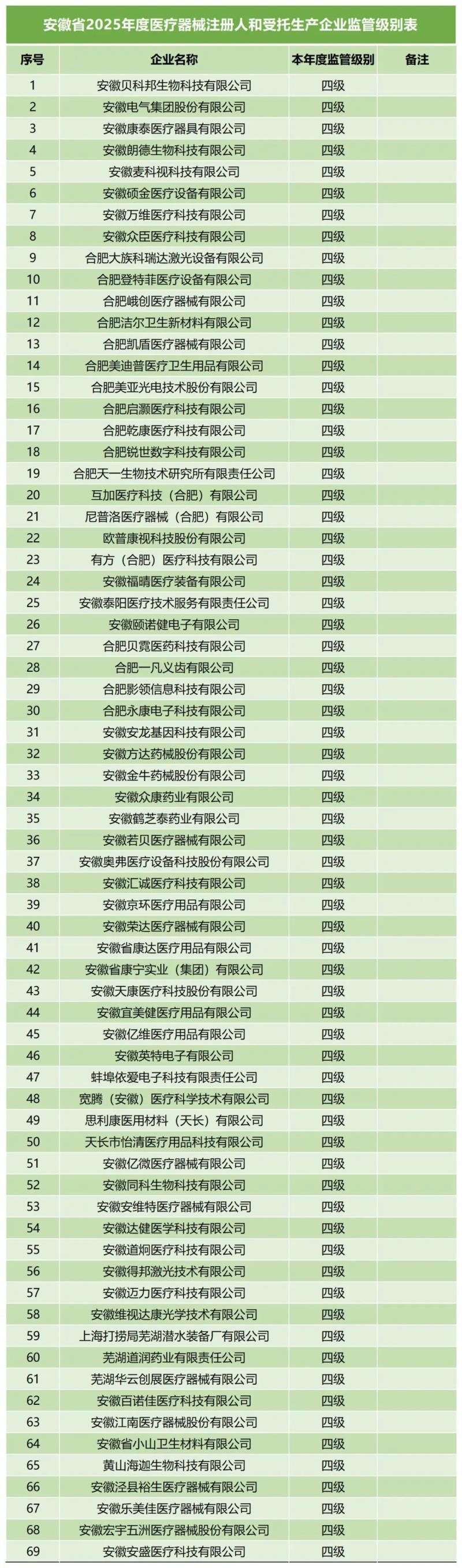 日前,安徽省藥監(jiān)局公布了2025年度醫(yī)療器械注冊人和受托生產企業(yè)監(jiān)管級別企業(yè)名單,我們通過查看附件發(fā)現,共有536家企業(yè),其中有69家企業(yè)為四級監(jiān)管,52家企業(yè)為三級監(jiān)管,其余415家企業(yè)為二級監(jiān)管。我們將四級監(jiān)管企業(yè)名單摘錄如下: