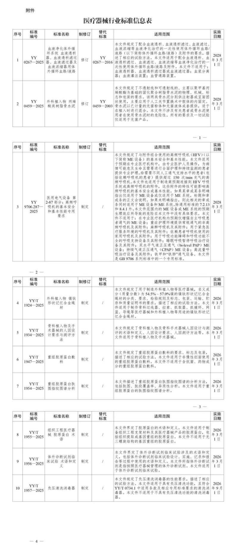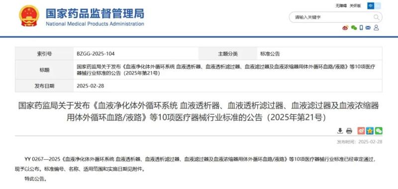 2月28日,國家藥監(jiān)局發(fā)布YY 0267-2025《血液凈化體外循環(huán)系統(tǒng) 血液透析器、血液透析濾過器、血液濾過器及血液濃縮器用體外循環(huán)血路/液路》、YY 9706.287-2025《醫(yī)用電氣設備 第2-87部分:高頻呼吸機的基本安全和基本性能專用要求》、YY/T 1947-2025《重組膠原蛋白敷料》等10項醫(yī)療器械行業(yè)標準,其中2項標準為修訂,8項為制定,最早自2026年3月1日起實施,具體明細如下: