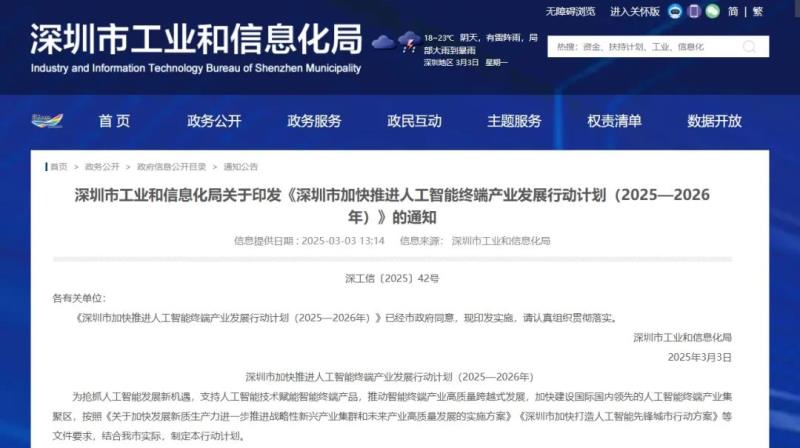 3月3日,深圳市工業(yè)和信息化局發(fā)布《深圳市加快打造人工智能先鋒城市行動計劃(2025—2026年)》(以下簡稱《行動計劃》),以搶抓人工智能發(fā)展新機遇,支持人工智能技術賦能智能終端產品,推動智能終端產業(yè)高質量跨越式發(fā)展,加快建設國際國內領先的人工智能終端產業(yè)集聚區(qū)。