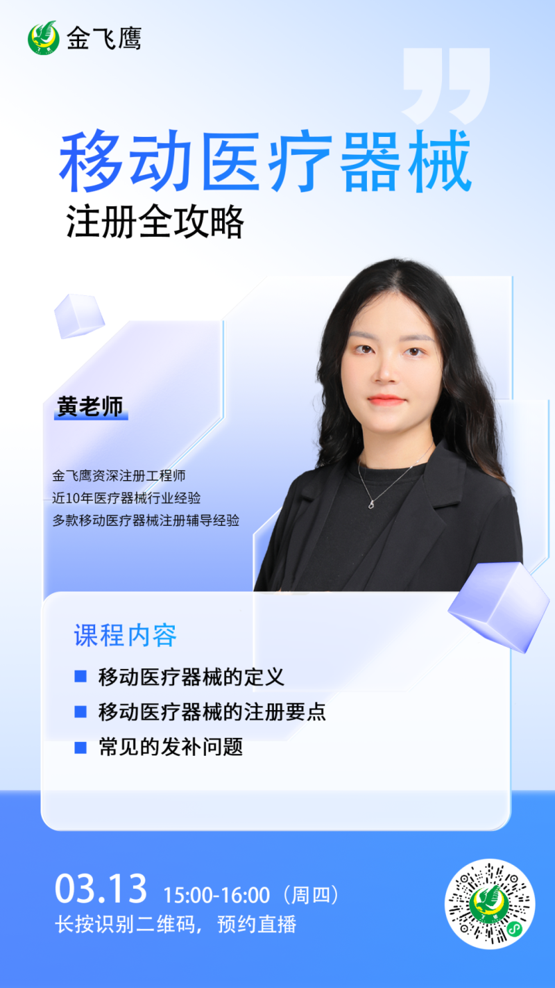 金飛鷹直播培訓簡介 金飛鷹直播培訓,是每周一次的固定培訓欄目,優(yōu)選金飛鷹國內外資深注冊/項目老師定期為大家講解醫(yī)療器械注冊相關知識,解答大家在醫(yī)療器械注冊過程中的諸多疑問。 此前我們已為大家?guī)硇掳驷t(yī)療器械生物學評價標準、新版醫(yī)療器械風險管理標準、醫(yī)療器械軟件注冊、醫(yī)療器械質量管理體系提升技巧等共計114次線上培訓課程,有興趣的可點擊視頻號直播回放進行查看~另外大家也一定很關注接下來的培訓主題,相關培訓預告我們會陸續(xù)添加至視頻號,請大家持續(xù)關注哦!
