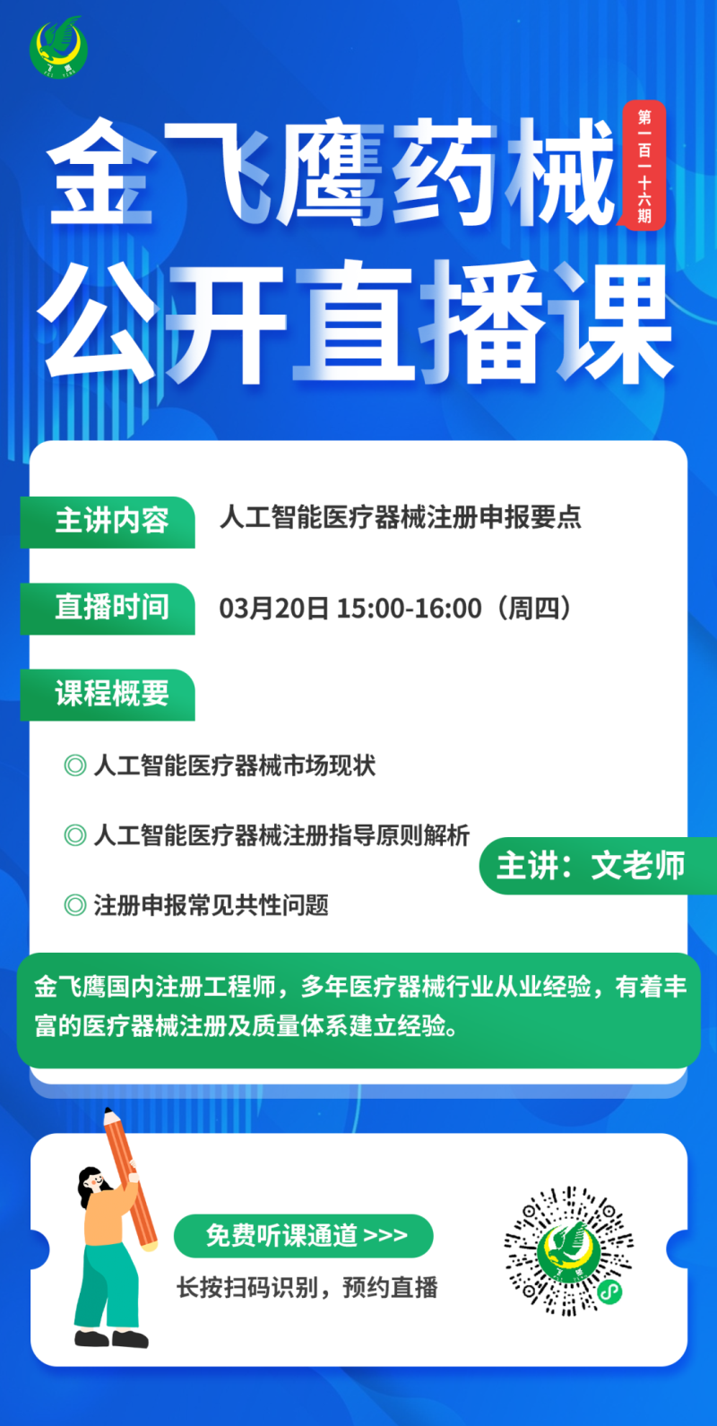 金飛鷹直播培訓(xùn)簡(jiǎn)介 金飛鷹直播培訓(xùn),是每周一次的固定培訓(xùn)欄目,優(yōu)選金飛鷹國(guó)內(nèi)外資深注冊(cè)/項(xiàng)目老師定期為大家講解醫(yī)療器械注冊(cè)相關(guān)知識(shí),解答大家在醫(yī)療器械注冊(cè)過(guò)程中的諸多疑問(wèn)。 此前我們已為大家?guī)?lái)新版醫(yī)療器械生物學(xué)評(píng)價(jià)標(biāo)準(zhǔn)、新版醫(yī)療器械風(fēng)險(xiǎn)管理標(biāo)準(zhǔn)、醫(yī)療器械軟件注冊(cè)、醫(yī)療器械質(zhì)量管理體系提升技巧等共計(jì)115次線上培訓(xùn)課程,有興趣的可點(diǎn)擊視頻號(hào)直播回放進(jìn)行查看~另外大家也一定很關(guān)注接下來(lái)的培訓(xùn)主題,相關(guān)培訓(xùn)預(yù)告我們會(huì)陸續(xù)添加至視頻號(hào),請(qǐng)大家持續(xù)關(guān)注哦!