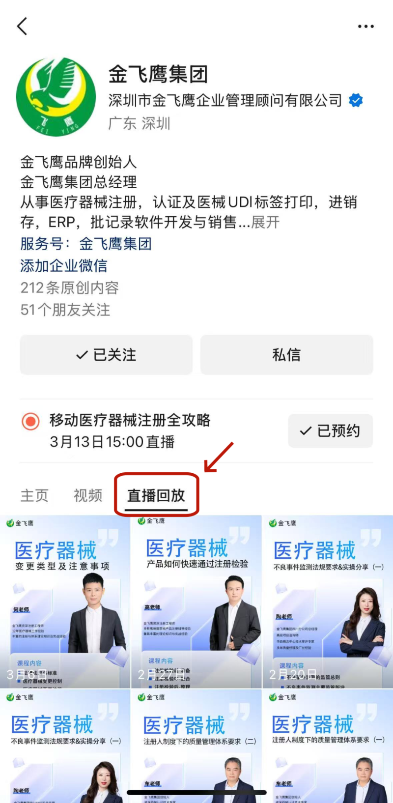往期直播培訓(xùn)課程支持回放,關(guān)注“金飛鷹藥械咨詢服務(wù)”視頻號(hào)并點(diǎn)擊視頻號(hào)主頁(yè),即可查看“直播回放”哦~