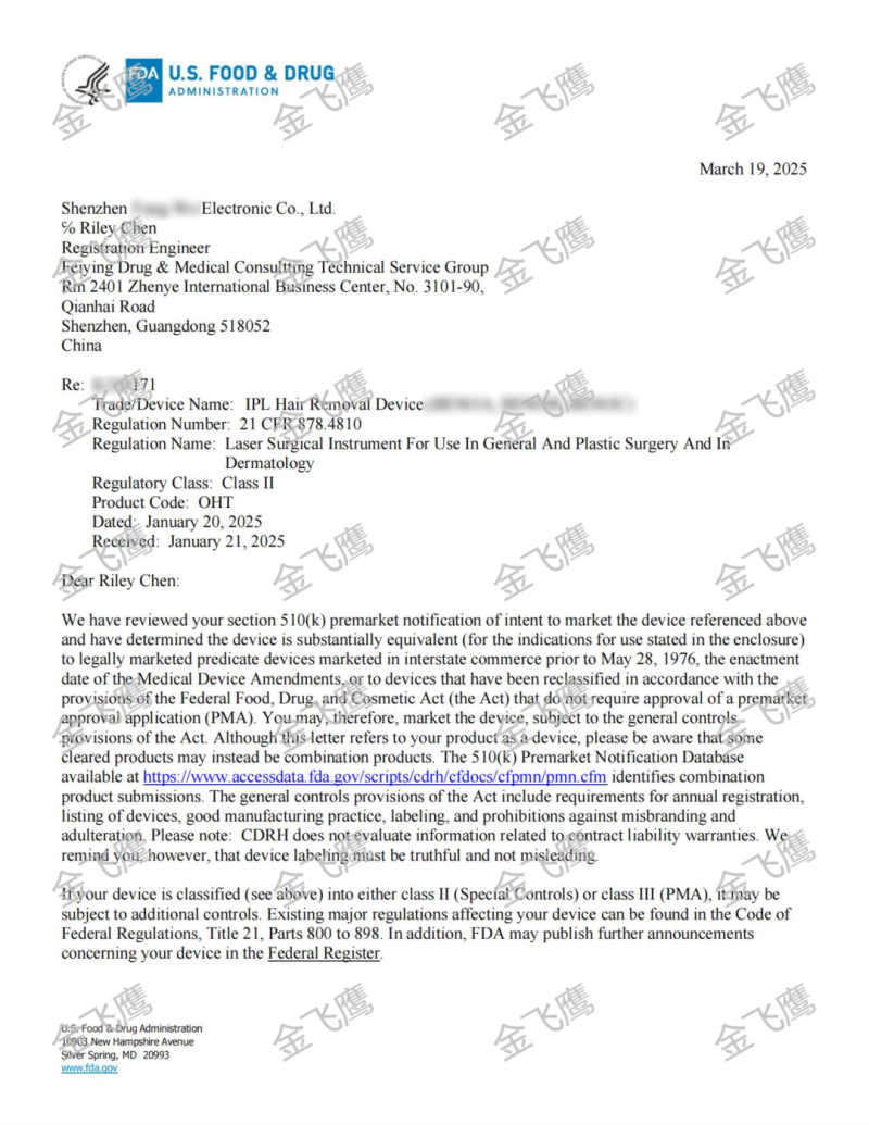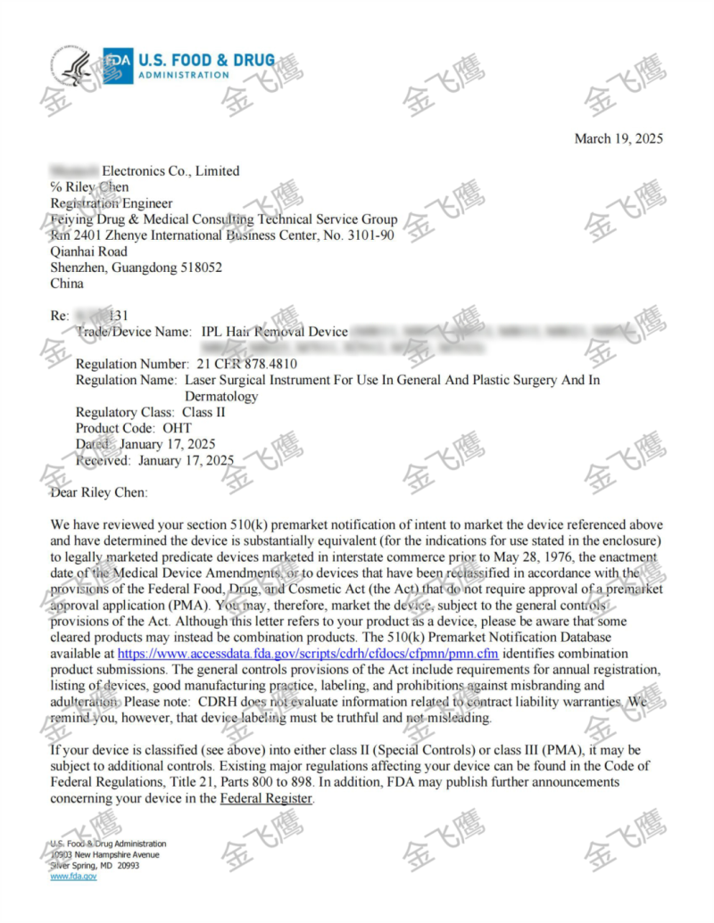 憑借我們深耕行業(yè)18年的深厚積淀與卓越的技術實力,近日金飛鷹連續(xù)輔導多家企業(yè)的多款產(chǎn)品獲批FDA 510(k),其中包括氣壓腿部按摩器、SGRT系統(tǒng)以及今天的主角——我們申請的首例雙脈沖脫毛儀。這一系列成功案例,不僅彰顯了我們在醫(yī)療器械注冊咨詢領域的專業(yè)實力和行業(yè)領軍地位,更為國內(nèi)醫(yī)械企業(yè)加速布局海外市場提供了堅實的技術支持與戰(zhàn)略保障。