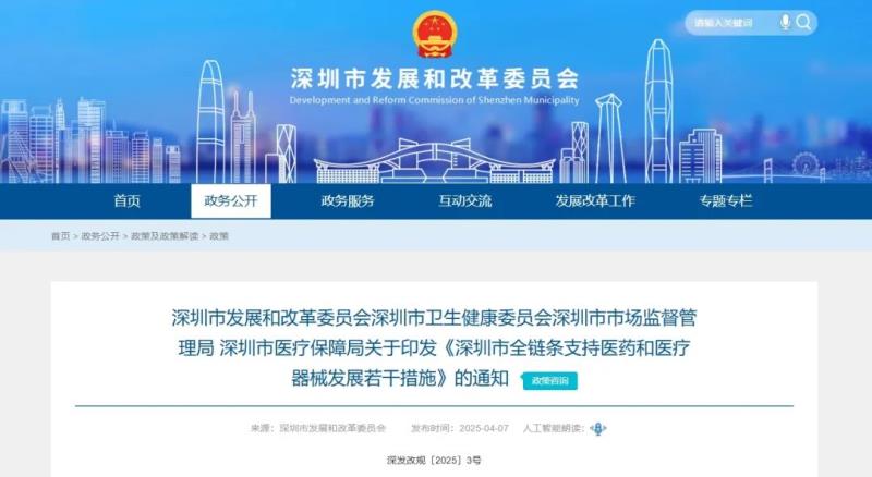 4月7日,深圳市發(fā)展和改革委員會、深圳市衛(wèi)生健康委員會、深圳市市場監(jiān)督管理局、深圳市醫(yī)療保障局四部門聯(lián)合發(fā)布《深圳市全鏈條支持醫(yī)藥和醫(yī)療器械發(fā)展若干措施》(以下簡稱《措施》),聚焦研發(fā)創(chuàng)新、人工智能應用、臨床試驗、注冊審批、生產(chǎn)制造、推廣應用、企業(yè)出海、人才與金融賦能、投資促進9大方面,共提出32條措施,以充分發(fā)揮深圳科技創(chuàng)新、先進制造、深港合作等優(yōu)勢,大力發(fā)展醫(yī)藥和醫(yī)療器械研發(fā)經(jīng)濟,全鏈條支持醫(yī)藥和醫(yī)療器械產(chǎn)業(yè)快速發(fā)展做大做強,將深圳建設(shè)成為國內(nèi)領(lǐng)先、國際一流的醫(yī)藥和醫(yī)療器械產(chǎn)業(yè)集聚發(fā)展高地。