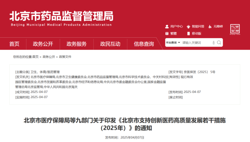 4月7日,北京市醫(yī)療保障局、北京市藥監(jiān)局等九部門發(fā)布《北京市支持創(chuàng)新醫(yī)藥高質(zhì)量發(fā)展若干措施(2025年)》(以下簡稱《措施》),《措施》共分為八個(gè)部分,包括:持續(xù)促進(jìn)臨床試驗(yàn)提質(zhì)增效(5條)、不斷提升審評審批效能(6條)、持續(xù)擴(kuò)大創(chuàng)新醫(yī)藥生產(chǎn)流通(6條)、持續(xù)推動創(chuàng)新醫(yī)藥臨床使用(5條)、人工智能賦能醫(yī)藥創(chuàng)新發(fā)展(2條)、加強(qiáng)創(chuàng)新醫(yī)藥投融資支持(2條)、優(yōu)化創(chuàng)新醫(yī)藥產(chǎn)業(yè)布局(2條)和保障措施(4條)。