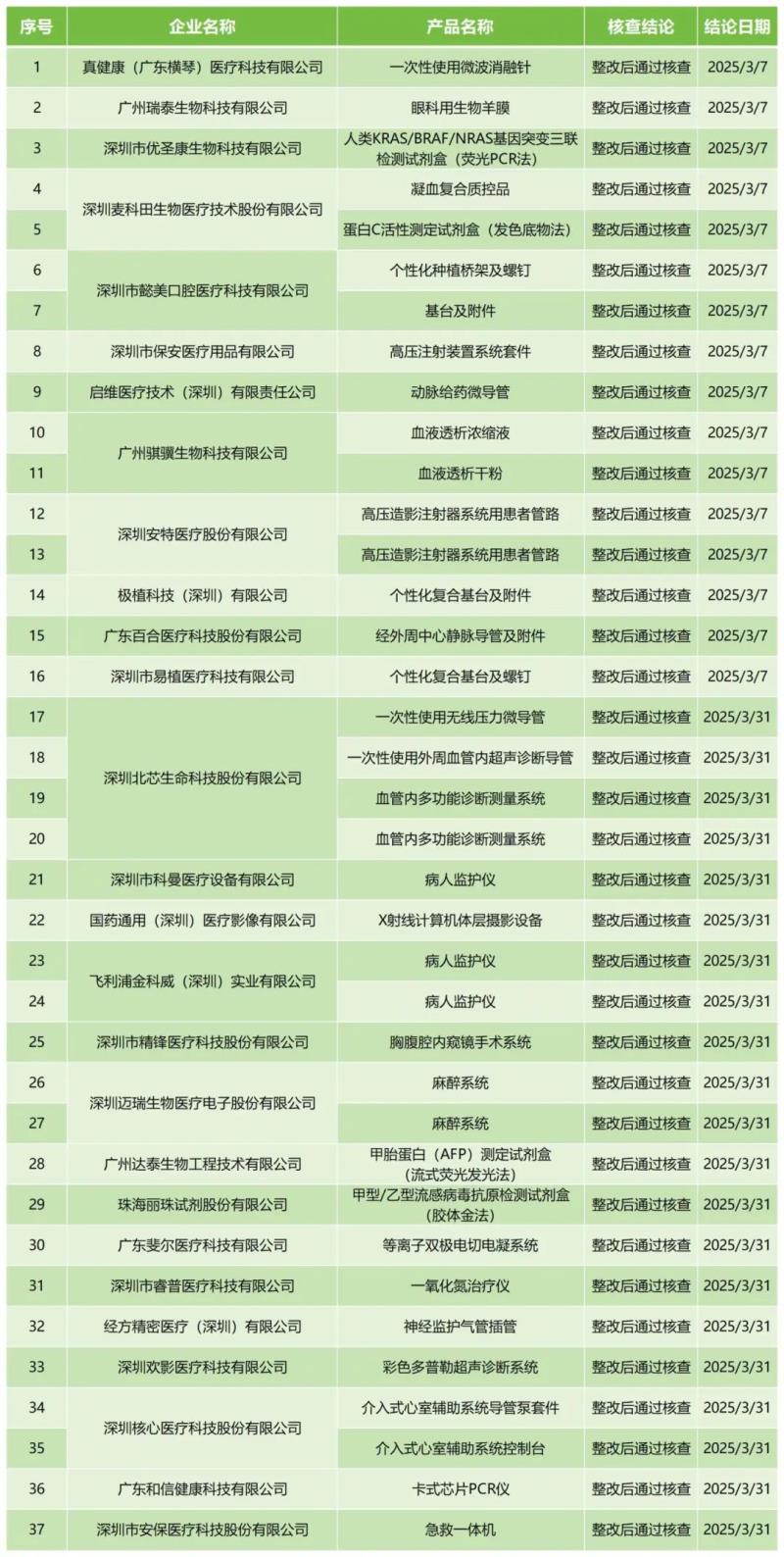 4月10日,廣東省藥監(jiān)局官網(wǎng)公布2025年3月醫(yī)療器械注冊(cè)質(zhì)量管理體系核查結(jié)果,包括真健康(廣東橫琴)醫(yī)療科技有限公司的一次性使用微波消融針、深圳市科曼醫(yī)療設(shè)備有限公司的病人監(jiān)護(hù)儀、深圳市精鋒醫(yī)療科技股份有限公司的胸腹腔內(nèi)窺鏡手術(shù)系統(tǒng)、深圳邁瑞生物醫(yī)療電子股份有限公司的麻醉系統(tǒng)等共計(jì)37款產(chǎn)品,均為“整改后通過(guò)核查”。具體明細(xì)見(jiàn)下方表格: