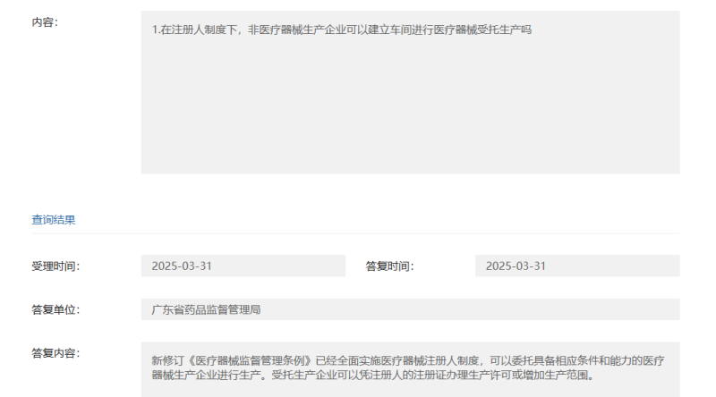 根據(jù)廣東省藥監(jiān)局的答復(fù),新修訂《醫(yī)療器械監(jiān)督管理條例》已經(jīng)全面實施醫(yī)療器械注冊人制度,可以委托具備相應(yīng)條件和能力的醫(yī)療器械生產(chǎn)企業(yè)進(jìn)行生產(chǎn)。受托生產(chǎn)企業(yè)可以憑注冊人的注冊證辦理生產(chǎn)許可或增加生產(chǎn)范圍。