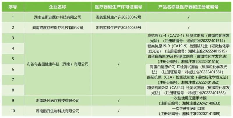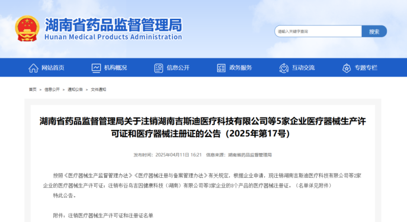 4月11日,湖南省藥監(jiān)局發(fā)布公告稱,按照《醫(yī)療器械監(jiān)督管理條例》《醫(yī)療器械生產(chǎn)監(jiān)督管理辦法》有關規(guī)定,根據(jù)企業(yè)申請,現(xiàn)注銷湖南吉斯迪醫(yī)療科技有限公司等2家企業(yè)的醫(yī)療器械生產(chǎn)許可證;注銷布谷鳥吉因健康科技(湖南)有限公司、湖南躍凡醫(yī)療科技有限公司等3家企業(yè)的8個產(chǎn)品的醫(yī)療器械注冊證,具體明細如下: