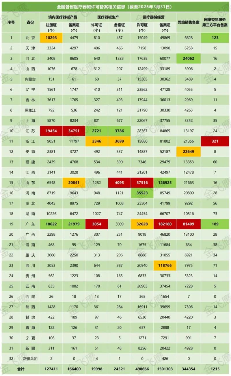 近日,國(guó)家藥監(jiān)局公布了截至2025年3月31日各省有效期內(nèi)醫(yī)療器械產(chǎn)品注冊(cè)備案、醫(yī)療器械生產(chǎn)企業(yè)許可備案等信息,老規(guī)矩,金飛鷹小編對(duì)此稍作編輯,標(biāo)注紅色、綠色、黃色的分別為前三甲。