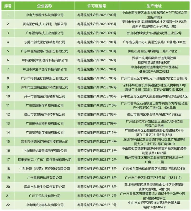 近日,廣東省藥監(jiān)局公布了《2025年3月醫(yī)療器械生產(chǎn)許可證核發(fā)清單》,據(jù)該公開數(shù)據(jù)顯示,該月中山光禾醫(yī)療科技有限公司、辰浩醫(yī)療科技(深圳)有限公司、東莞市創(chuàng)成醫(yī)療器械有限公司等共計(jì)22家企業(yè)新拿到了醫(yī)療器械生產(chǎn)許可證,具體明細(xì)如下: