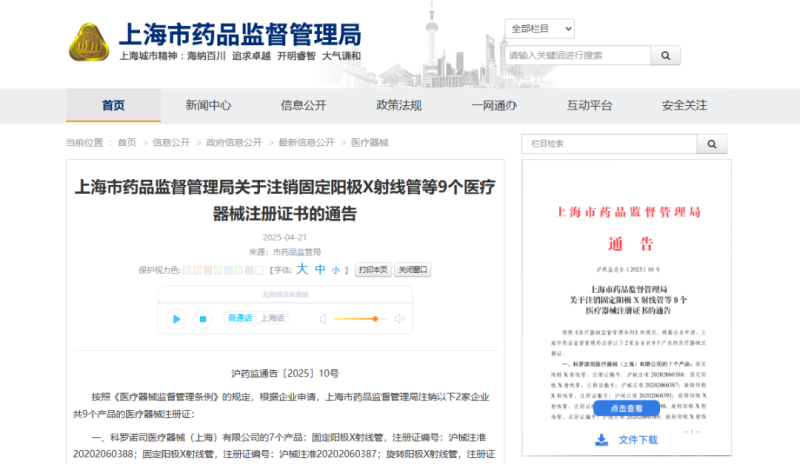 4月21日,上海市藥監(jiān)局發(fā)布通告稱,按照《醫(yī)療器械監(jiān)督管理?xiàng)l例》的規(guī)定,根據(jù)企業(yè)申請(qǐng),該局已注銷科羅諾司醫(yī)療器械(上海)有限公司等2家企業(yè)共9個(gè)產(chǎn)品的醫(yī)療器械注冊(cè)證,包括固定陽極X射線管、數(shù)字中功率耳背式助聽器等,具體明細(xì)如下:
