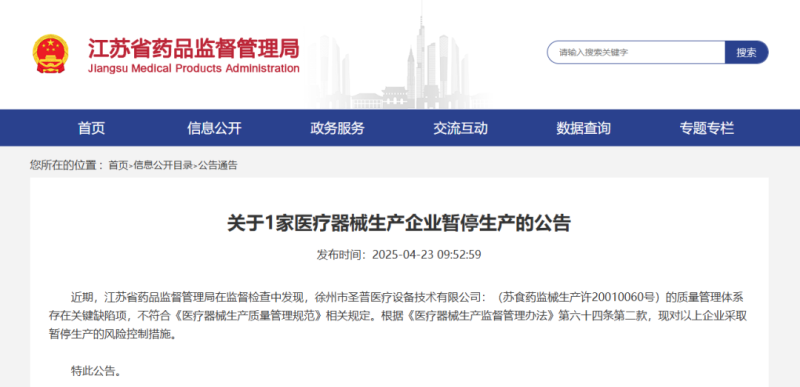 近日,江蘇省藥監(jiān)局發(fā)布公告稱(chēng),該局在監(jiān)督檢查中發(fā)現(xiàn),徐州市**醫(yī)療設(shè)備技術(shù)有限公司(蘇食藥監(jiān)械生產(chǎn)許20010060號(hào))的質(zhì)量管理體系存在關(guān)鍵缺陷項(xiàng),不符合《醫(yī)療器械生產(chǎn)質(zhì)量管理規(guī)范》相關(guān)規(guī)定。根據(jù)《醫(yī)療器械生產(chǎn)監(jiān)督管理辦法》第六十四條第二款,現(xiàn)對(duì)以上企業(yè)采取暫停生產(chǎn)的風(fēng)險(xiǎn)控制措施。