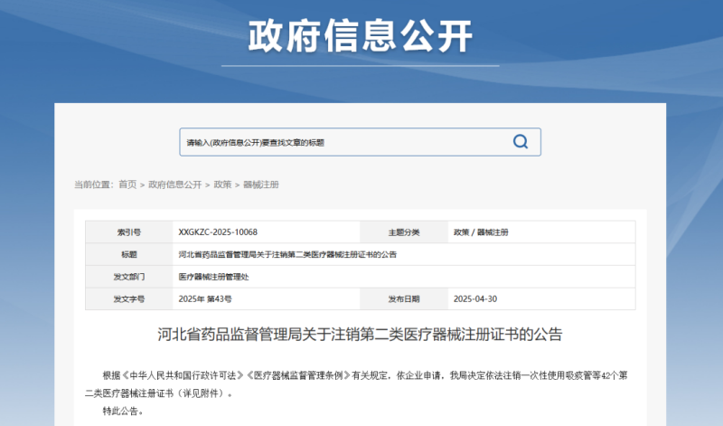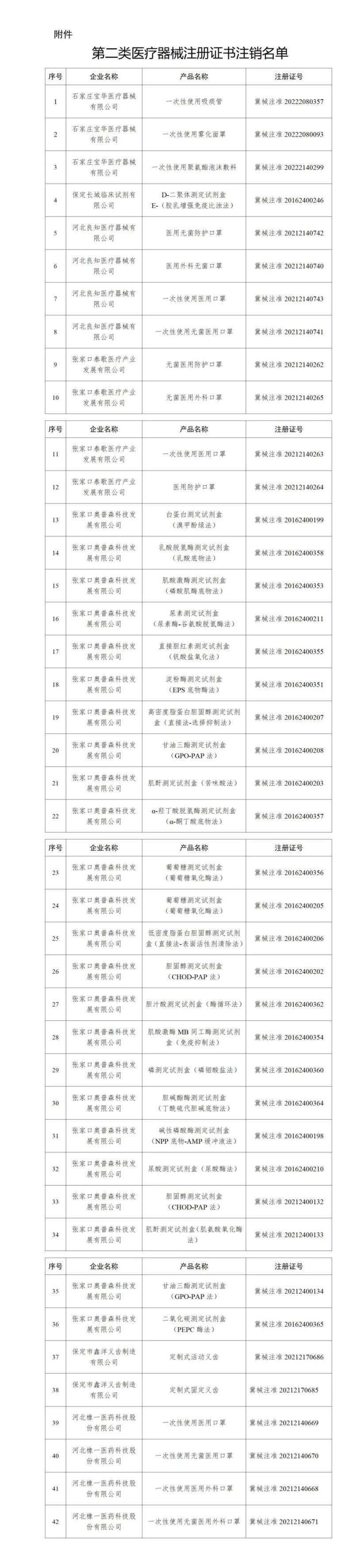 近日,河北省藥監(jiān)局發(fā)布公告稱,根據(jù)《中華人民共和國行政許可法》《醫(yī)療器械監(jiān)督管理?xiàng)l例》有關(guān)規(guī)定,依企業(yè)申請,該局依法注銷了42個(gè)第二類醫(yī)療器械注冊證書,其中有12款產(chǎn)品為醫(yī)用口罩,還有一次性使用吸痰管、一次性使用霧化面罩、一次性使用聚氨酯泡沫敷料、定制式活動(dòng)義齒等,具體明細(xì)如下:
