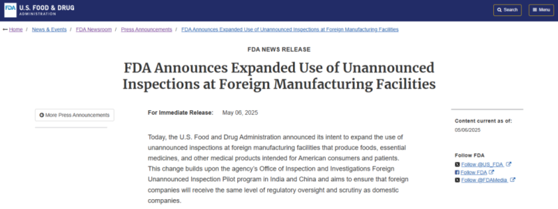 據(jù)FDA所述,長期以來,海外企業(yè)在美國FDA的檢查中享受“提前通知”的特權(quán),而美國本土企業(yè)則需接受嚴(yán)格的無預(yù)警檢查。這種雙重標(biāo)準(zhǔn)使得海外企業(yè)有時(shí)間準(zhǔn)備,掩蓋問題,損害了監(jiān)管的公正性與有效性。
