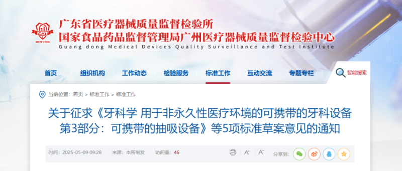 近日,廣東省醫(yī)療器械質(zhì)量監(jiān)督檢驗(yàn)所發(fā)布通知稱,根據(jù)《國家藥監(jiān)局綜合司關(guān)于印發(fā)2025年醫(yī)療器械行業(yè)標(biāo)準(zhǔn)制修訂計(jì)劃項(xiàng)目的通知》的要求,以及全國口腔材料和器械設(shè)備標(biāo)準(zhǔn)化技術(shù)委員會齒科設(shè)備與器械分技術(shù)委員會2025年的標(biāo)準(zhǔn)制修訂工作安排,齒科分技委組織相關(guān)起草單位完成了《牙科學(xué) 用于非永久性醫(yī)療環(huán)境的可攜帶的牙科設(shè)備 第3部分:可攜帶的抽吸設(shè)備》《牙科學(xué) 根管器械 第2部分:擴(kuò)大鉆》等5項(xiàng)標(biāo)準(zhǔn)草案征求意見稿,具體如下: