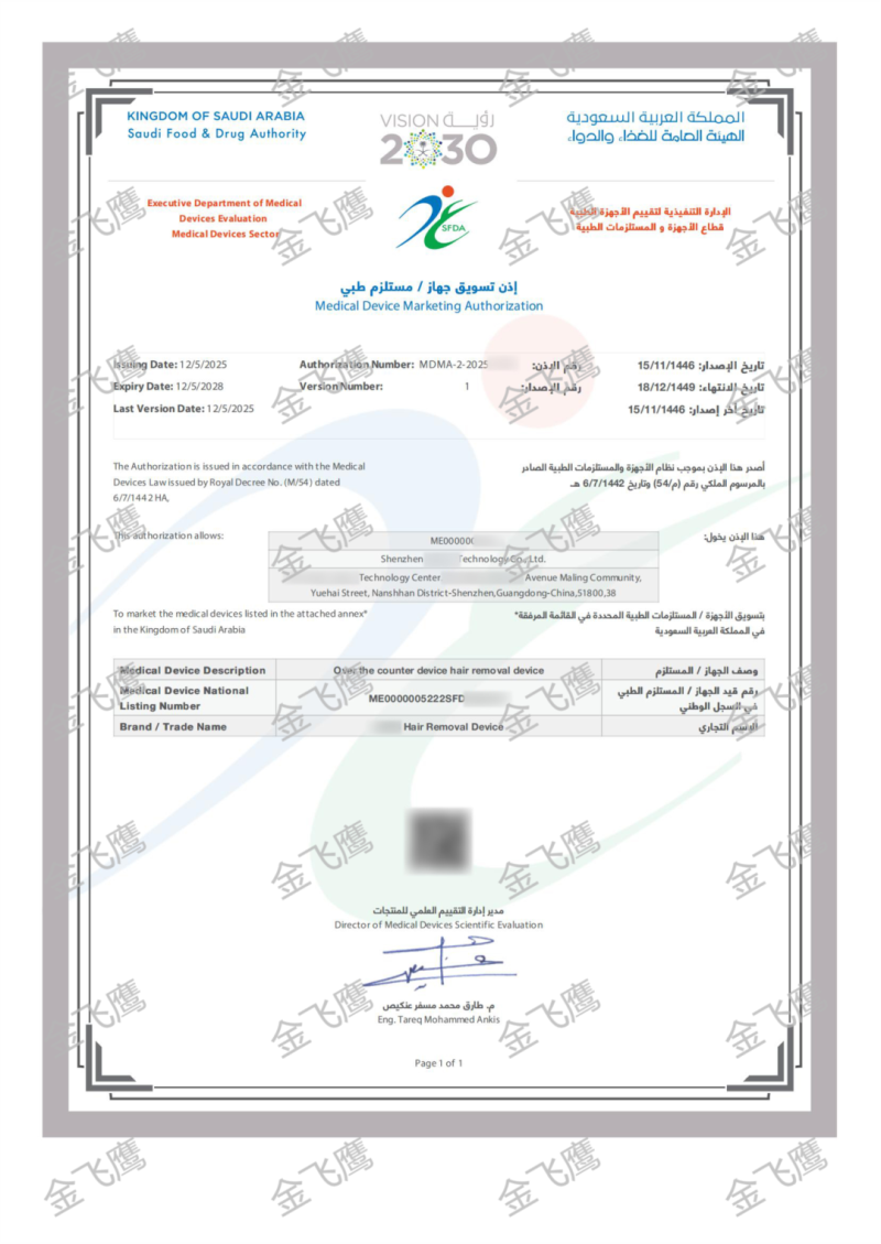 繼美容面罩后,金飛鷹又成功輔導深圳一家企業(yè)取得脫毛儀的沙特上市許可