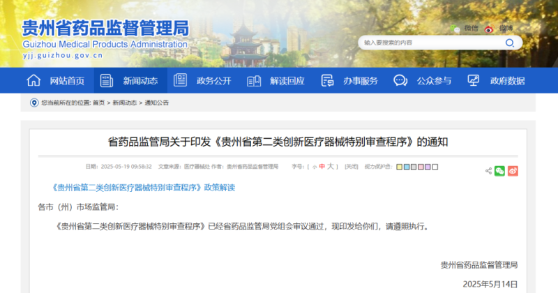 5月19日,貴州省藥監(jiān)局發(fā)布《貴州省第二類創(chuàng)新醫(yī)療器械特別審查程序》(以下簡(jiǎn)稱《程序》),其中提到,符合以下條件的,申請(qǐng)人可以向省局申請(qǐng)第二類創(chuàng)新醫(yī)療器械特別審查: