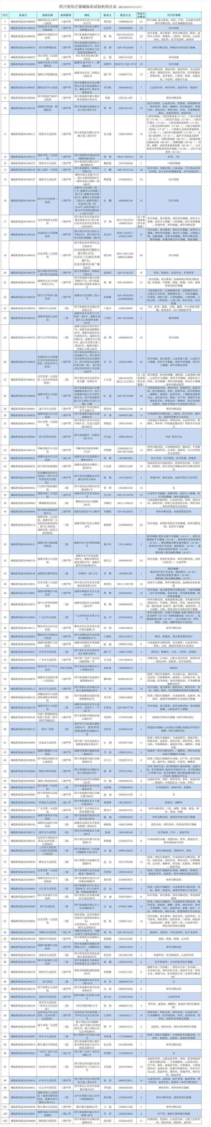 5月21日,四川省藥監(jiān)局公開(kāi)了《四川省醫(yī)療器械臨床試驗(yàn)機(jī)構(gòu)目錄(截至2025年5月15日)》(以下簡(jiǎn)稱《目錄》),我們通過(guò)查看附件發(fā)現(xiàn),四川省目前共有103家醫(yī)療器械臨床試驗(yàn)機(jī)構(gòu),以成都市的機(jī)構(gòu)最多(共48家),我們將《目錄》以圖片形式轉(zhuǎn)載如下: