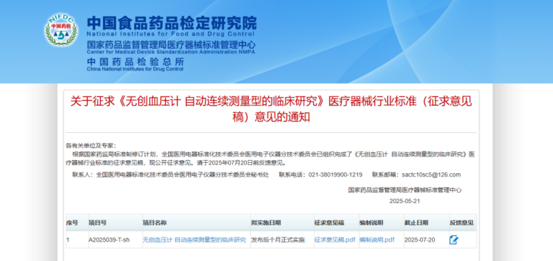 近日,國家藥監(jiān)局醫(yī)療器械標(biāo)準(zhǔn)管理中心發(fā)布《無創(chuàng)血壓計 自動連續(xù)測量型的臨床研究》醫(yī)療器械行業(yè)標(biāo)準(zhǔn)(征求意見稿),并向社會公開征求意見。