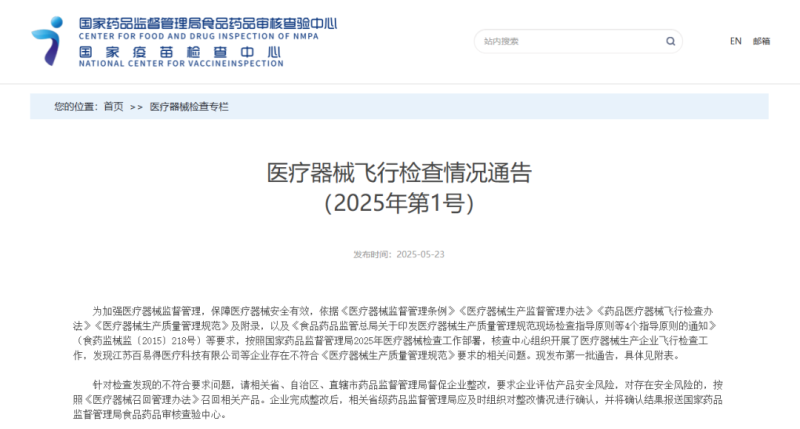 近日,國家藥監(jiān)局食品藥品審核查驗中心(以下簡稱“核查中心”)發(fā)布《醫(yī)療器械飛行檢查情況通告(2025年第1號)》,其中提到,核查中心組織開展了醫(yī)療器械生產(chǎn)企業(yè)飛行檢查工作,發(fā)現(xiàn)江蘇百易得醫(yī)療科技有限公司、朔崛(江蘇)醫(yī)療科技有限公司、江西洪達(dá)醫(yī)療器械集團(tuán)有限公司等18家企業(yè)存在不符合《醫(yī)療器械生產(chǎn)質(zhì)量管理規(guī)范》要求的相關(guān)問題,生產(chǎn)品種包括不可吸收帶線錨釘、血液透析濃縮液、髖關(guān)節(jié)假體、醫(yī)用膠原填充劑、注射用交聯(lián)透明質(zhì)酸鈉凝膠等。