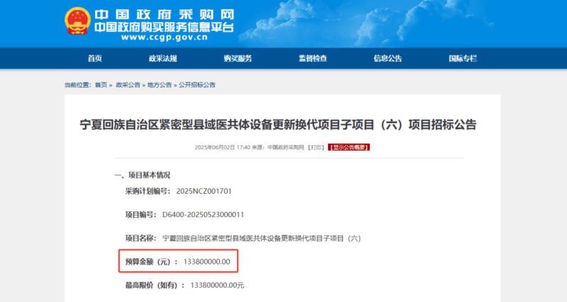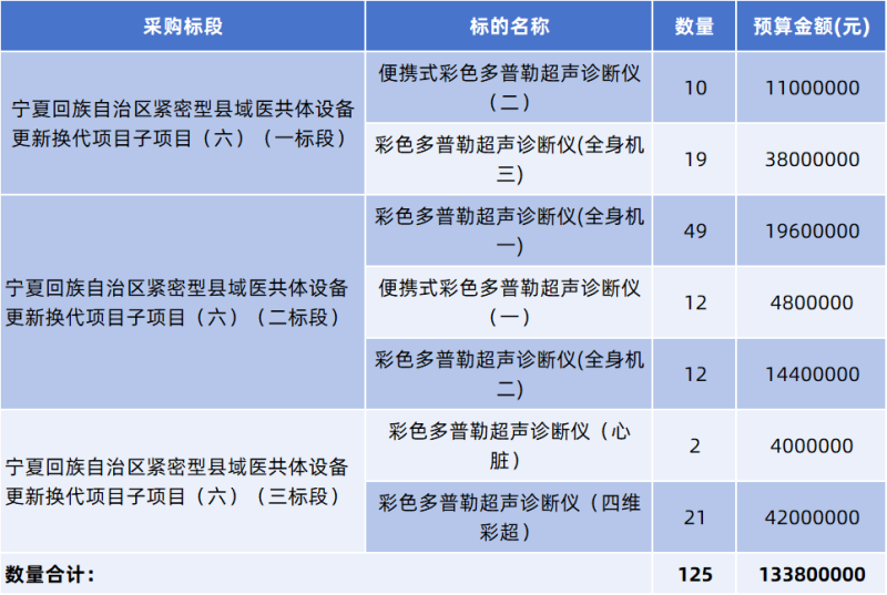 6月2日,中國政府采購網(wǎng)發(fā)布了《寧夏回族自治區(qū)緊密型縣域醫(yī)共體設(shè)備更新?lián)Q代項(xiàng)目子項(xiàng)目(六)項(xiàng)目招標(biāo)公告》,125臺彩色多普勒超聲診斷儀采購大單啟動(dòng)。