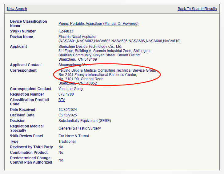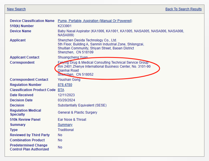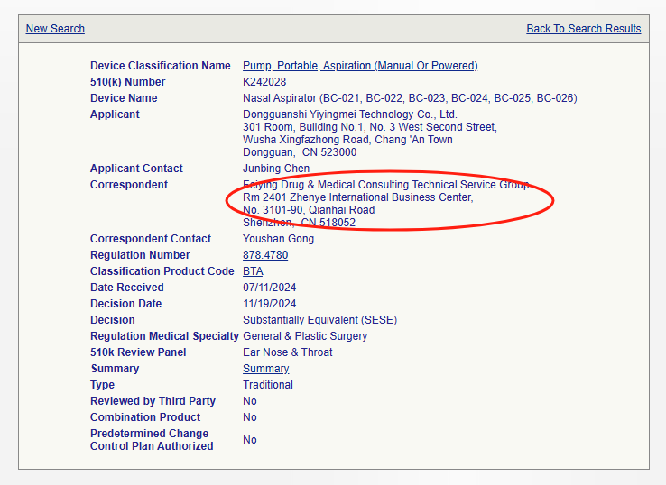 我們在FDA 510(k)數(shù)據(jù)庫用產(chǎn)品代碼BTA進(jìn)行檢索,近兩年來由金飛鷹申報并作為官方Correspondent的有如下企業(yè)的吸鼻器產(chǎn)品: