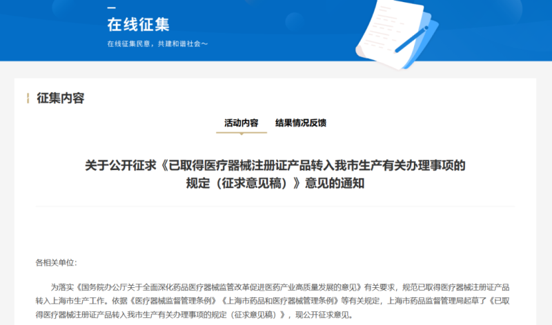 近日,上海市藥監(jiān)局發(fā)布《已取得醫(yī)療器械注冊(cè)證產(chǎn)品轉(zhuǎn)入我市生產(chǎn)有關(guān)辦理事項(xiàng)的規(guī)定》(以下簡(jiǎn)稱(chēng)《規(guī)定》),并向社會(huì)公開(kāi)征求意見(jiàn)。