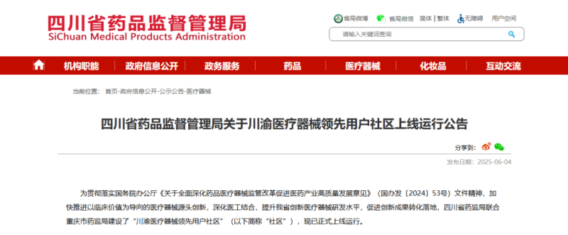 該社區(qū)平臺的開發(fā)上線是落實(shí)國務(wù)院辦公廳《關(guān)于全面深化藥品醫(yī)療器械監(jiān)管改革促進(jìn)醫(yī)藥產(chǎn)業(yè)高質(zhì)量發(fā)展意見》(國辦發(fā)〔2024〕53號)文件精神的重要舉措。四川省藥監(jiān)局相關(guān)負(fù)責(zé)人表示,今后將持續(xù)拓展優(yōu)化社區(qū)平臺功能,逐步擴(kuò)大行業(yè)用戶覆蓋面,進(jìn)一步整合省內(nèi)臨床和醫(yī)療器械研發(fā)資源,為醫(yī)療器械創(chuàng)新研發(fā)提供全方位、全過程的服務(wù)支撐,助力臨床研究成果轉(zhuǎn)化,營造良好醫(yī)療器械創(chuàng)新生態(tài)。