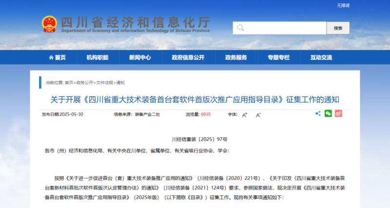 近日,四川省經(jīng)濟(jì)和信息化廳發(fā)布《關(guān)于開展〈四川省重大技術(shù)裝備首臺套軟件首版次推廣應(yīng)用指導(dǎo)目錄〉征集工作的通知》(以下簡稱《通知》),其中提到,申請列入《四川省重大技術(shù)裝備首臺套軟件首版次推廣應(yīng)用指導(dǎo)目錄(2025版)》的重大技術(shù)裝備產(chǎn)品應(yīng)能夠支撐打造現(xiàn)代產(chǎn)業(yè)體系、建設(shè)國家戰(zhàn)略腹地,重點聚焦人工智能、低空經(jīng)濟(jì)、航空航天、新能源、高端能源裝備、新能源汽車及動力電池等重點產(chǎn)業(yè)鏈領(lǐng)域,工業(yè)母機(jī)、軌道交通裝備等領(lǐng)先領(lǐng)域,行業(yè)專用裝備等優(yōu)勢領(lǐng)域,先進(jìn)核技術(shù)應(yīng)用裝備、未來交通裝備、深空深地裝備等新興和未來領(lǐng)域,以及重大工程施工裝備、農(nóng)機(jī)裝備、應(yīng)急裝備、醫(yī)療裝備、民生裝備等領(lǐng)域。