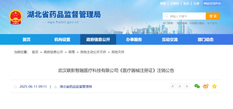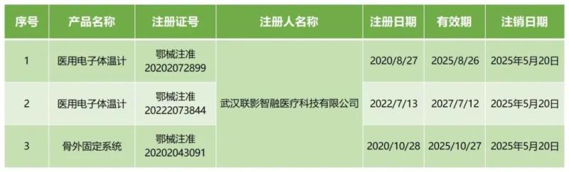 6月11日,湖北省藥監(jiān)局發(fā)布三則《醫(yī)療器械注冊證》注銷公告,我們通過查看公告內(nèi)容發(fā)現(xiàn),被注銷的注冊證均來自同一家公司——武漢聯(lián)影智融醫(yī)療科技有限公司,產(chǎn)品包括醫(yī)用電子體溫計(jì)及骨外固定系統(tǒng),以下為具體明細(xì):