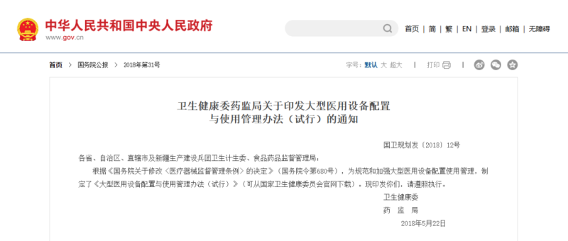根據(jù)《大型醫(yī)用設(shè)備配置與使用管理辦法(試行)》,大型醫(yī)用設(shè)備,是指使用技術(shù)復(fù)雜、資金投入量大、運(yùn)行成本高、對(duì)醫(yī)療費(fèi)用影響大且納入目錄管理的大型醫(yī)療器械。