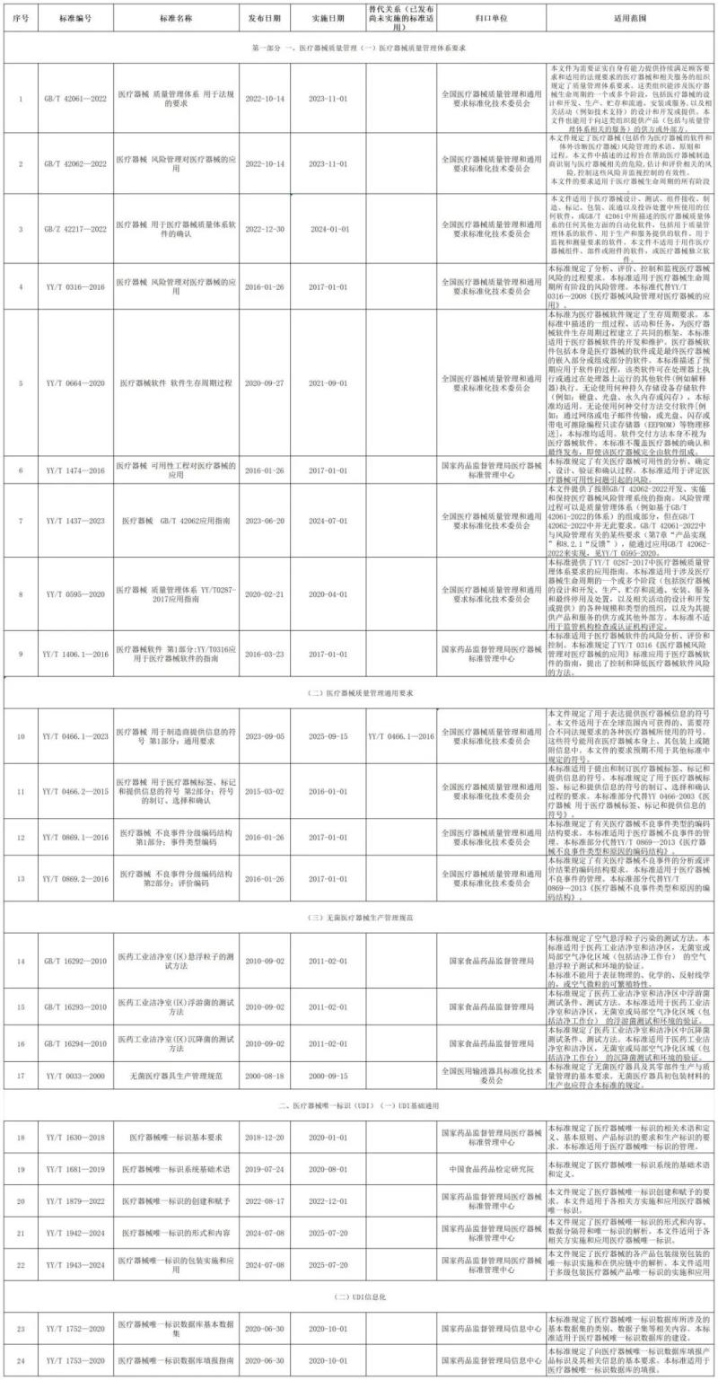 國家藥監(jiān)局將上述2039項(xiàng)標(biāo)準(zhǔn)的適用范圍以及標(biāo)準(zhǔn)層級、效力、名稱、歸口單位等信息,按照通用技術(shù)領(lǐng)域和專業(yè)技術(shù)領(lǐng)域進(jìn)行編排,通用技術(shù)領(lǐng)域細(xì)分為醫(yī)療器械質(zhì)量管理、醫(yī)療器械唯一標(biāo)識(shí)、醫(yī)療器械包裝、醫(yī)療器械生物學(xué)評價(jià)、醫(yī)用電氣設(shè)備通用要求、消毒滅菌通用技術(shù)、醫(yī)療器械臨床評價(jià)及其他8個(gè)部分,專業(yè)技術(shù)領(lǐng)域細(xì)分為外科手術(shù)器械、醫(yī)用防護(hù)器械、醫(yī)用X射線設(shè)備及用具、醫(yī)學(xué)實(shí)驗(yàn)室與體外診斷器械和試劑等33個(gè)部分。我們對該標(biāo)準(zhǔn)目錄部分展示如下:
