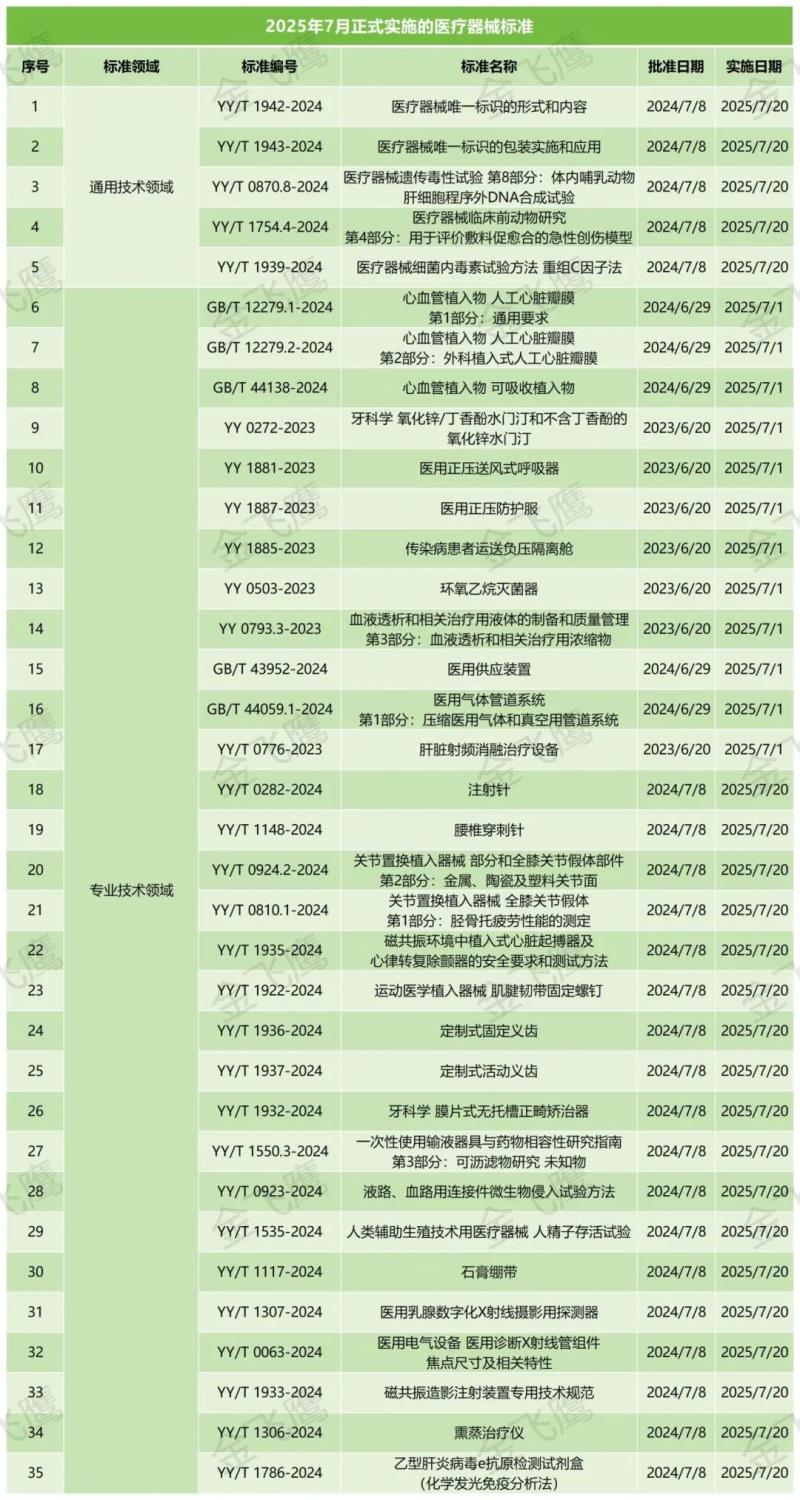 根據(jù)金飛鷹匯總整理,2025年7月起正式實施的醫(yī)療器械標準共有35項,其中已于7月1日實施的有GB/T 12279.1-2024《心血管植入物 人工心臟瓣膜 第1部分:通用要求》、YY 1887-2023《醫(yī)用正壓防護服》、YY 0503-2023《環(huán)氧乙烷滅菌器》等共12項,即將于7月20日實施的有YY/T 1942-2024《醫(yī)療器械唯一標識的形式和內容》、YY/T 0282-2024《注射針》、YY/T 1936-2024《定制式固定義齒》等共23項,具體明細如下: