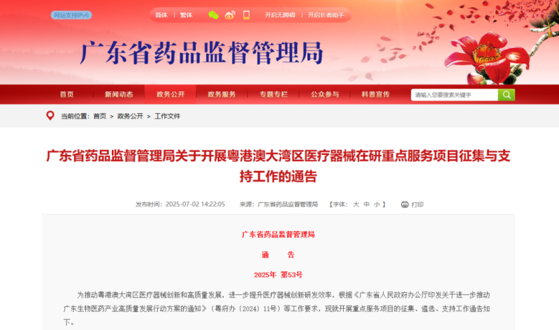 7月2日,廣東省藥監(jiān)局發(fā)布《關(guān)于開展粵港澳大灣區(qū)醫(yī)療器械在研重點(diǎn)服務(wù)項(xiàng)目征集與支持工作的通告》(以下簡稱《通告》),以推動(dòng)粵港澳大灣區(qū)醫(yī)療器械創(chuàng)新和高質(zhì)量發(fā)展,進(jìn)一步提升醫(yī)療器械創(chuàng)新研發(fā)效率。《通告》正文內(nèi)容如下: