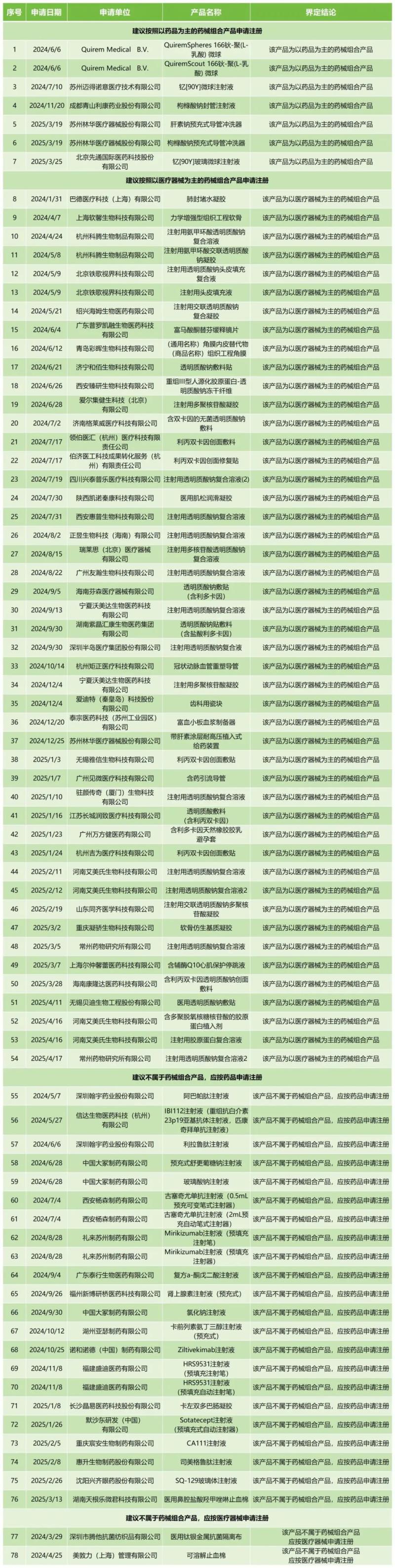 7月7日,中檢院匯總公開了2024年6月1日至2025年5月31日期間的藥械組合產(chǎn)品屬性界定結(jié)果,共包含78款產(chǎn)品,其中建議按照以藥品為主的藥械組合產(chǎn)品申請(qǐng)注冊(cè)有7款,建議按照以醫(yī)療器械為主的藥械組合產(chǎn)品申請(qǐng)注冊(cè)有47款,建議應(yīng)按藥品申請(qǐng)注冊(cè)的有22款,建議應(yīng)按醫(yī)療器械申請(qǐng)注冊(cè)有2款,具體明細(xì)如下: