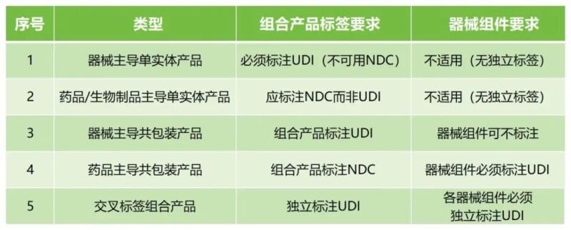 該草案提到,如21 CFR第3部分所述,組合產品由兩種或兩種以上不同類型的產品組成(即藥物、器械和/或生物制品的組合)。在組合產品中所包含的每種藥物、器械和生物制品都被稱為該組合產品的組成部分。一般包括單一實體組合產品、共包裝組合產品及交叉標簽組合產品等,相應的UDI要求如下: